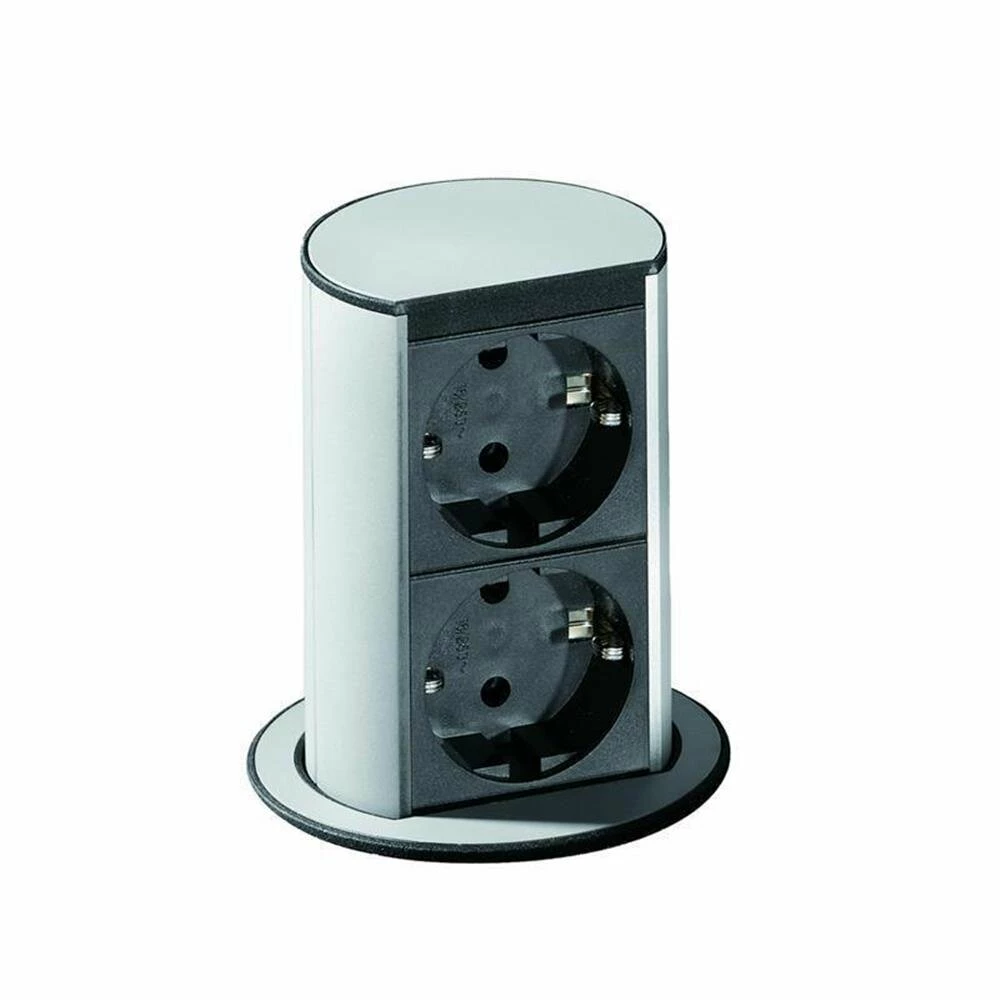 Versenkbares Steckdosenelement für Hängeschränke oder Arbeitsplatten. Nach leichtem Druck auf den Deckel fährt die Einheit über einen Federmechanismus aus und bietet eine komfortable und sichere Stromzufuhr. Einfaches und flächenbündiges Versenken bei Nichtgebrauch.