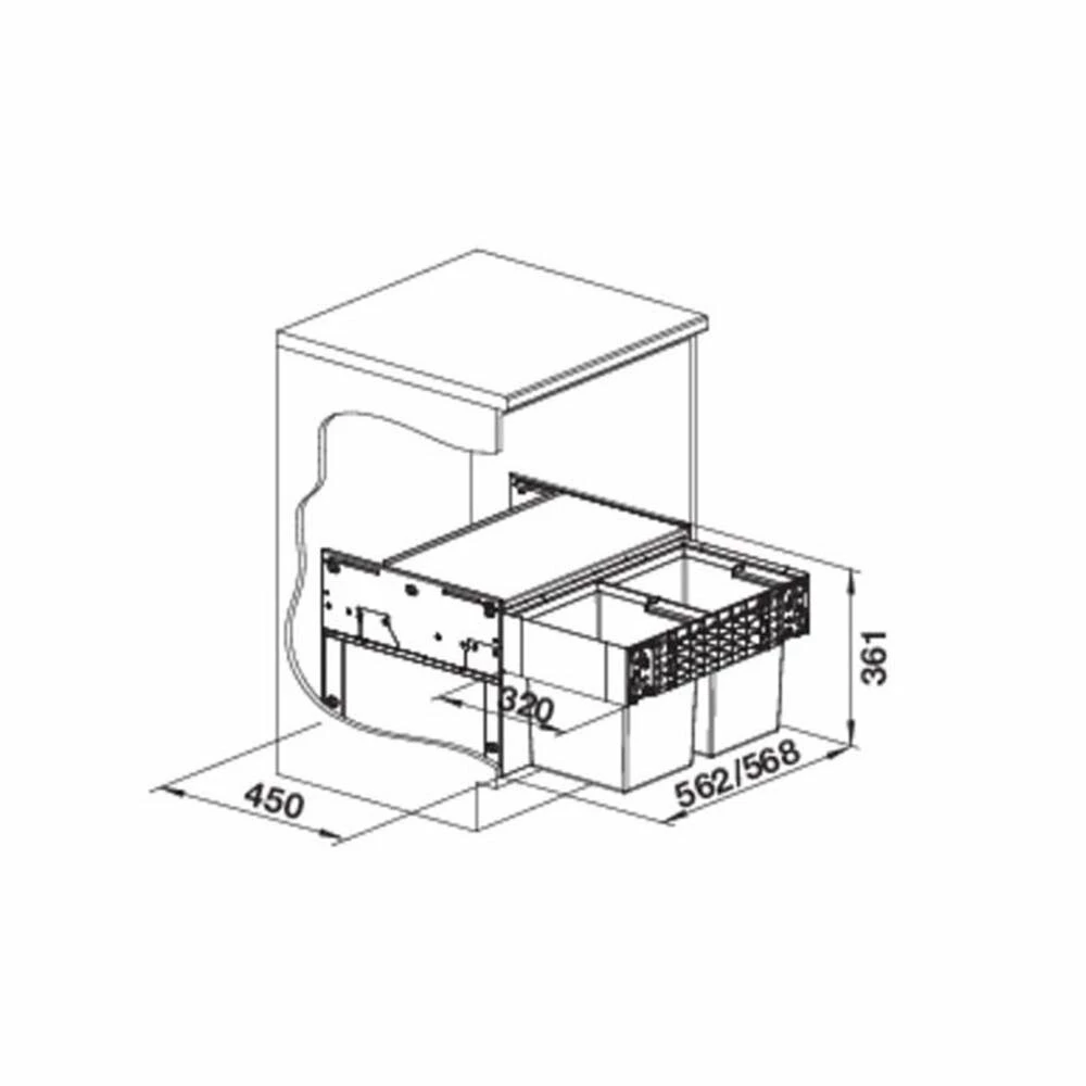 - Einbautiefe 320 mm: notwendige Schrankinnentiefe 450 mm (wegen der seitlichen Führungsschienen)