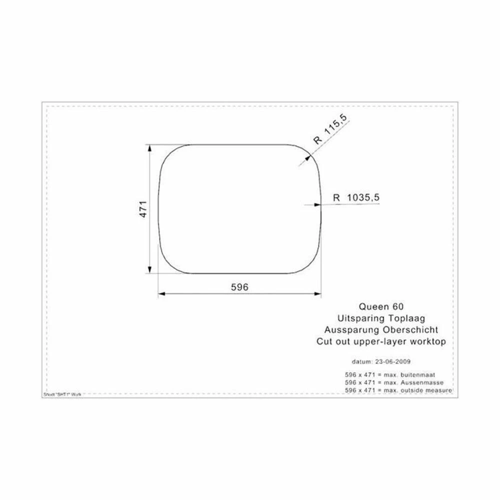 - Ausschnittmaße flächenbündiger Einbau: 596 x 471 mm (Radien nach Schablone)
