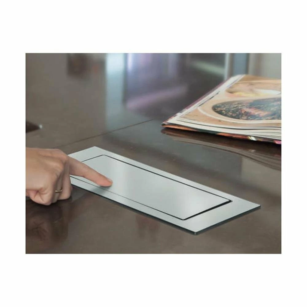 Geschlossen ist Evoline BackFlip nur eine dünne Platte auf der Arbeitsfläche. Mit einem Finger angetippt dreht er sich um 180 Grad und zeigt seine nützliche Seite: USB-Charger und Steckdose liegen so hoch über die Platte, dass sie vor Wasser geschützt sind.