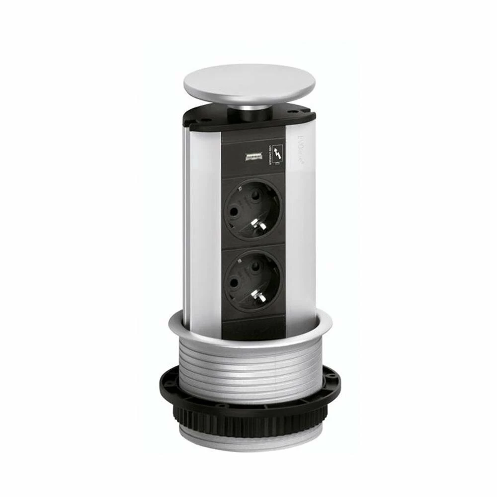 Schulte Evoline Port USB – versenkbare Energiebox mit 2 Schuko-Steckdosen + 1 USB/A-Buchse, Deckel silberfarbig | 8031148