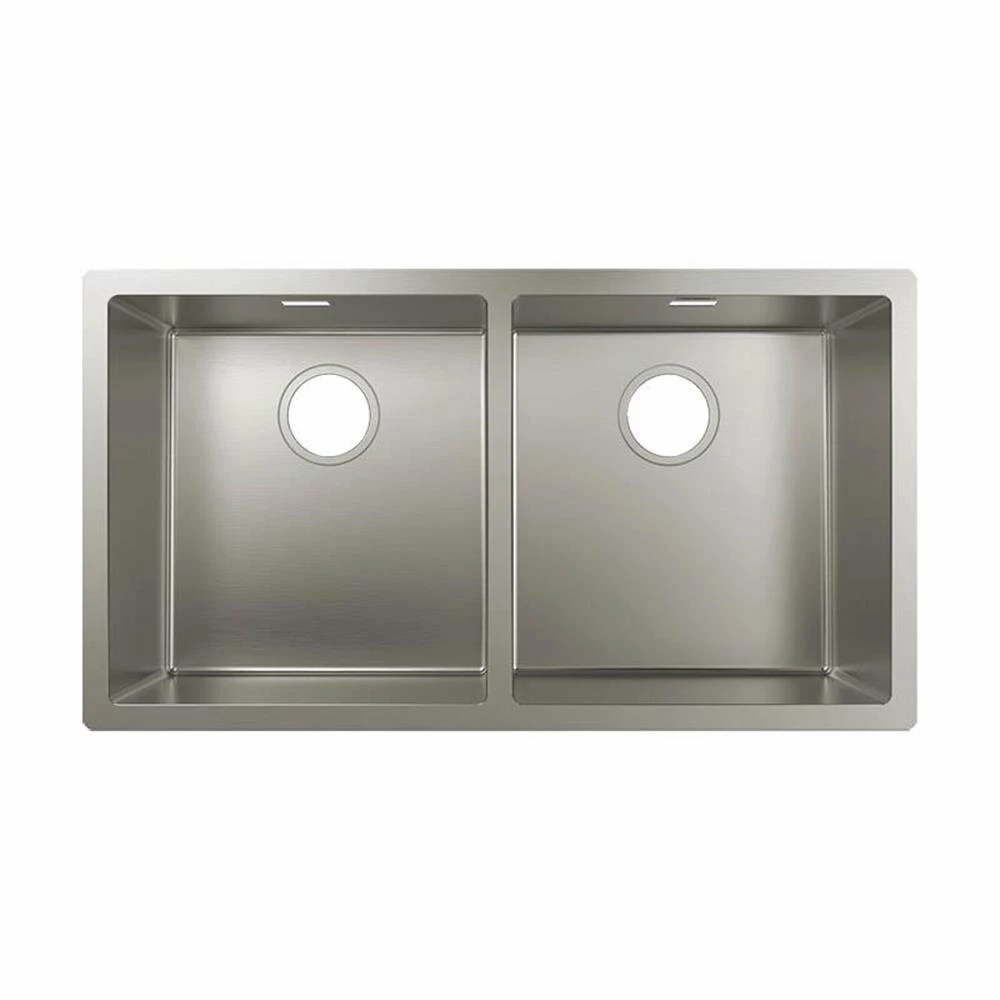 Die hansgrohe Doppel-Küchenspüle Einbau 370/370 aus Edelstahl für einen 90 cm Unterschrank ist mit zwei Hauptbecken perfekt auf die komfortable Küchenarbeit eingestellt.