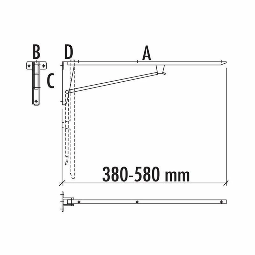 Solide Stahlkonstruktion. Die Klappkonsole rastet beim Aufklappen automatisch ein und kann ebenso leicht durch Anheben des Arretierungsarmes ausgerastet werden. Geeignet zum Beispiel für die Aufnahme von Arbeitsplatte, als abklappbare Tischplatte.