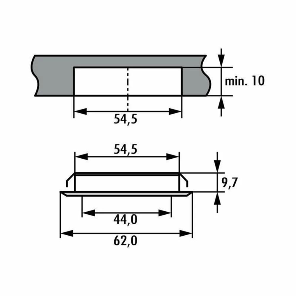 Durch Entfernen des Zwischenrings auch als Einbauleuchte zu verwenden. Dazu ist eine Sacklochbohrung notwendig: Durchmesser 55 bis 58 mm, Bohrtiefe min. 10 mm.