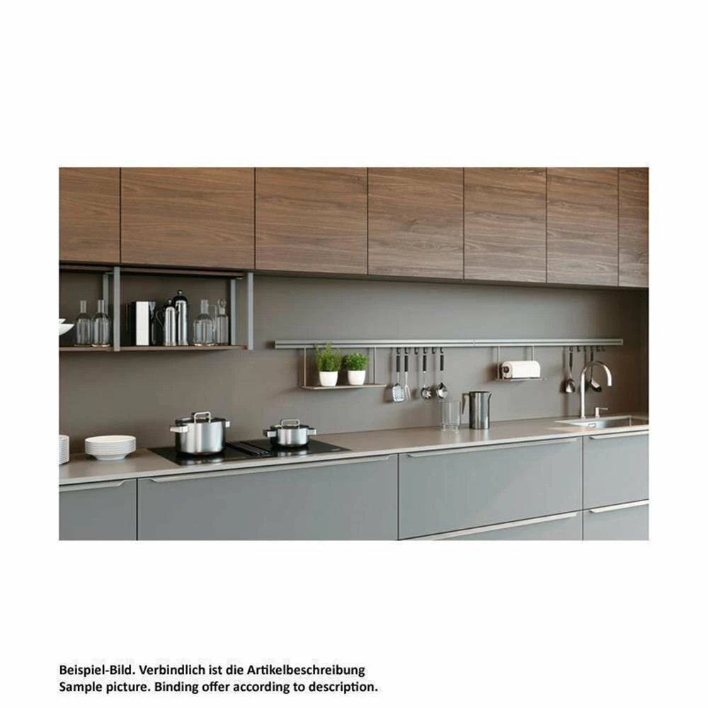 Das Aurora Relingsystem wertet die Küche durch sein einzigartiges Design auf. Die optionale LED-Beleuchtung akzentuiert diesen Küchenbereich eindrucksvoll. Die optionalen Zubehörteile werden durch einfaches Einhängen in die Reling sicher fixiert.