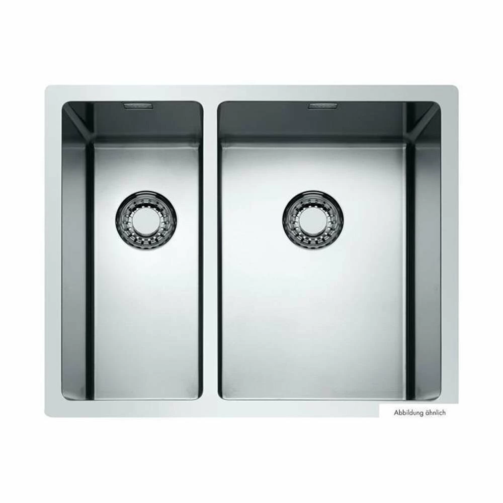 Mit Restebecken. Beide Becken mit 3½“ Ab- und Überlaufgarnitur und bodenbündigem Siebkorbventil. Bei Verwendung der mitgelieferten Befestigungsklammern vergrößert sich die benötigte Einbaubreite je Seite um ca. 30 mm bei der Unterbauspüle. Flacher Rand: auch geeignet für den flächenbündigen Einbau, Ausschnittmaß ca. 545 x 430 mm (Einbauspüle), Ausschnittmaß ca. 516 x 401 mm (Unterbauspüle), ohne Restebecken-Einsatz.