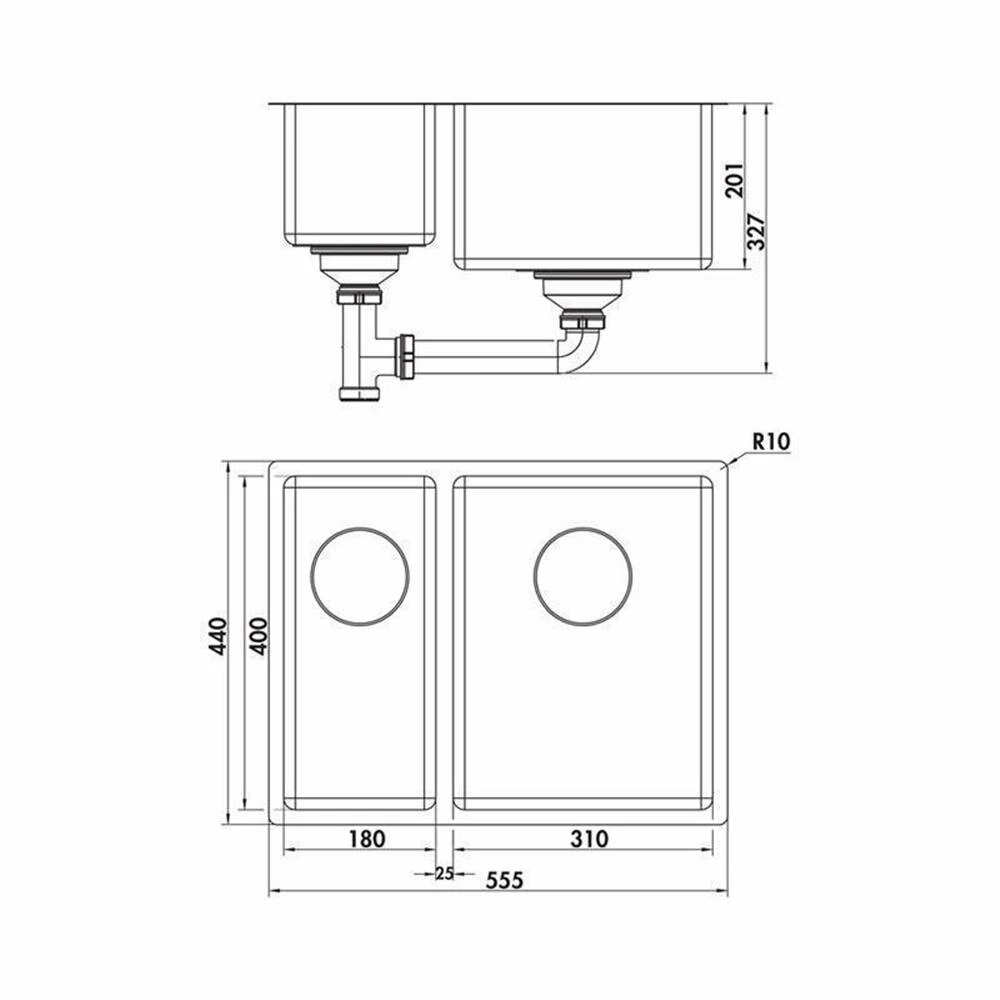 - Beckengröße: B 310 x T 400 x H 201 mm / B 180 x T 400 x H 201 mm