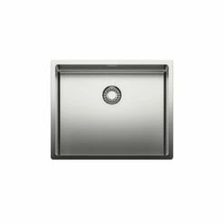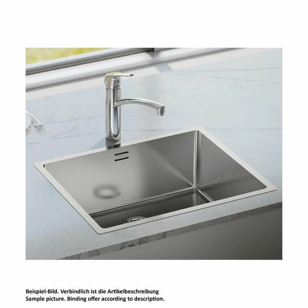 Einzelbecken. 3½“ Ab- und Überlaufgarnitur mit bodenbündigem Siebkorbventil. Bei Verwendung der mitgelieferten Befestigungsklammern vergrößert sich die benötigte Einbaubreite je Seite um ca. 30 mm bei der Unterbauspüle. Flacher Rand: auch geeignet für den flächenbündigen Einbau.