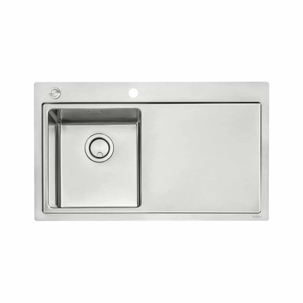 Zeitloses, puristisches Design folgt auch bei der Corno Ora dem gestalterischen grundprinzip der Corno-Linie: Form und Funktion auf das Wesentliche zu reduzieren. Flacher Rand und schmale Radien von 15 mm sind die prägende Merkmale. Der ergonomische Anordnung von tiefem Becken und großer Abtropffläche, verbunden durch eine Führungsschiene auf der gesamten Längsachse für die flexible Platzierung eines Schneidbrettes, erleichtern die Arbeitsabläufe beim Spülen und Vorbereiten. Qualitative Hochwertigkeit sichert die Fertigung aus Edelstahl in 1 Millimeter Materialstärke.