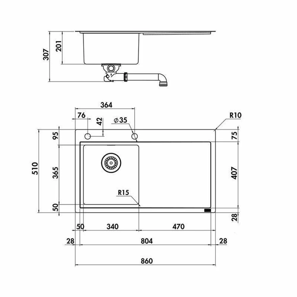 - Ausschnittmaß (Einbauspüle): ca. 840 x 490 mm