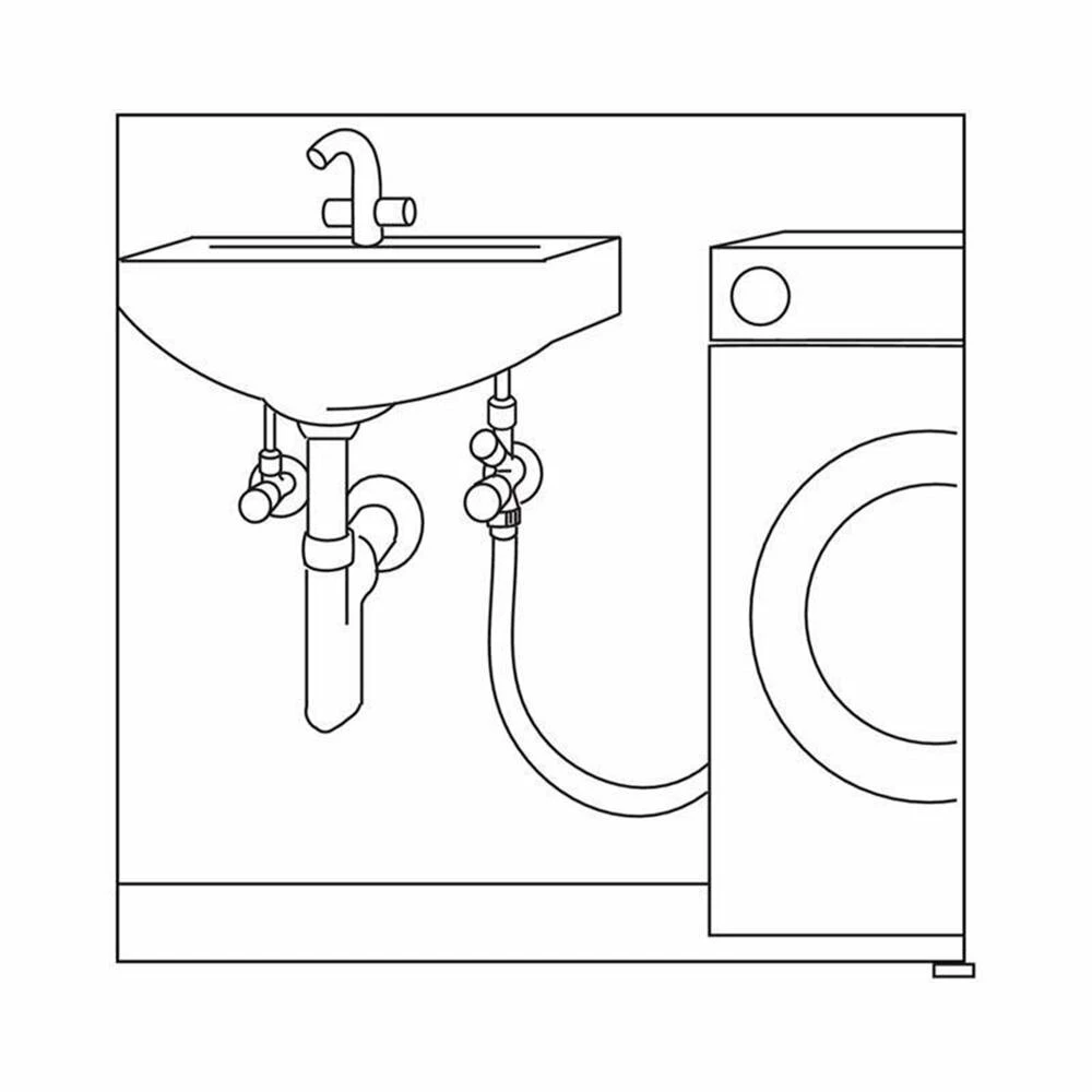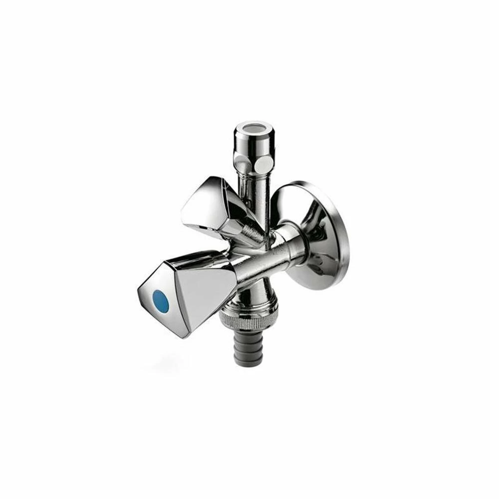 Verchromte Armatur zum Anschluss von Geschirrspüler und Waschmaschinen, mit selbstdichtendem Gewinde, mit Rückflussverhinderer, Längenausgleichsverschraubung, Kronengriff und Schubrosette.