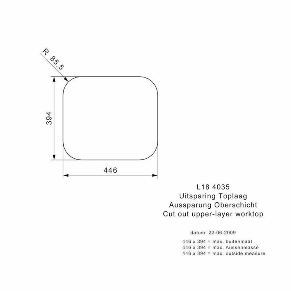 - Ausschnittmaße flächenbündiger Einbau: 446 x 394 mm R85,5