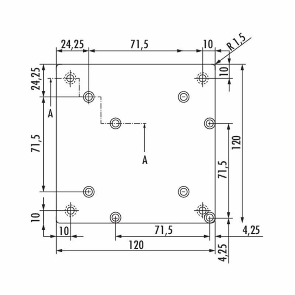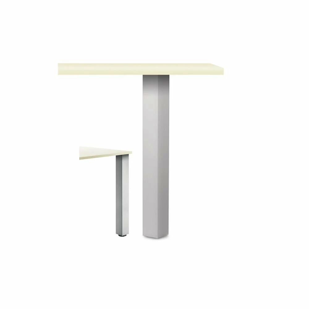 Edelstahlfarbiger Vierkantfuß zur Verbindung mit aufliegenden Holz-Tischplatten. Die Befestigungsplatte für die aufliegende Platte kann sowohl mittig als auch auf Eck montiert werden.