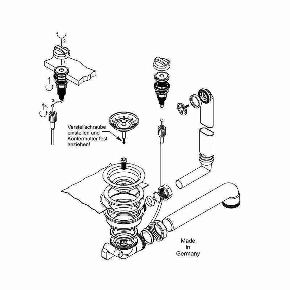 - Lieferumfang: 3,5″ Korbventil für Excenter-Betätigung + Ablauf-Kelch+ Überlauf (Metall-Rosette rund) + Excenter-Betätigung (Drehknopf Oberfläche Chrom Glanz) + Raumsparabgang 1,5″
