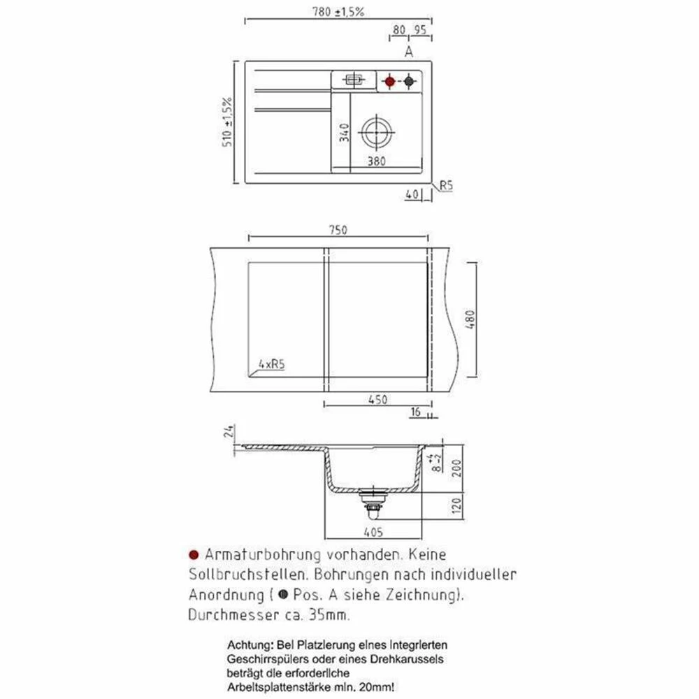 - Spülenmaß: B 756 x T 486 mm
