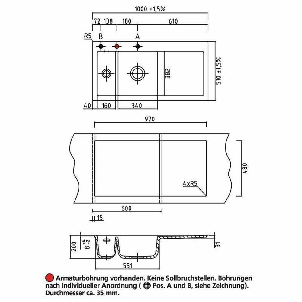 - Beckenabmessung: 340 x 385 x 200 mm / 160 x 385 x 200 mm