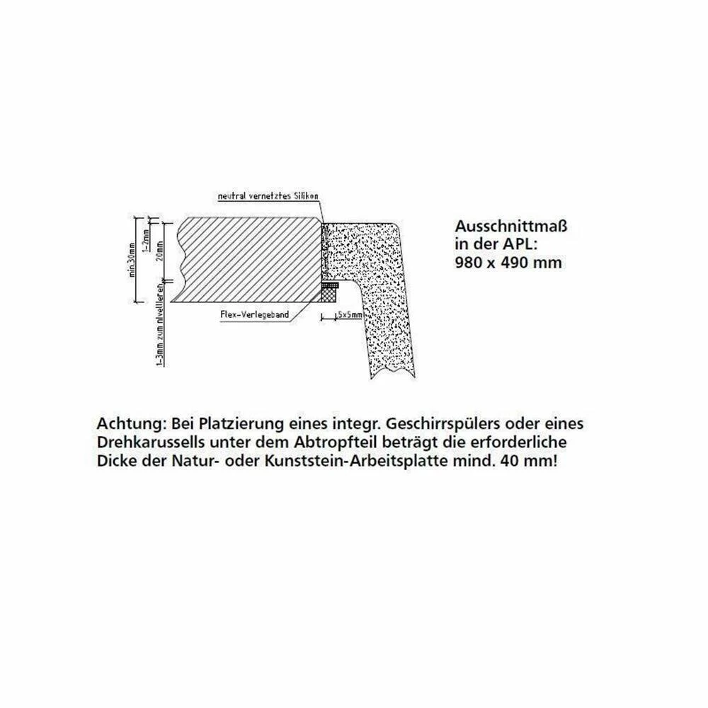 - bei Spülen mit Ablauffläche und einem Geschirrspüler oder einem Eck-Unterschrank mit Karussell-Drehbeschlag unter der Ablauffläche beträgt die Mindest-Arbeitsplattenstärke 40 mm
