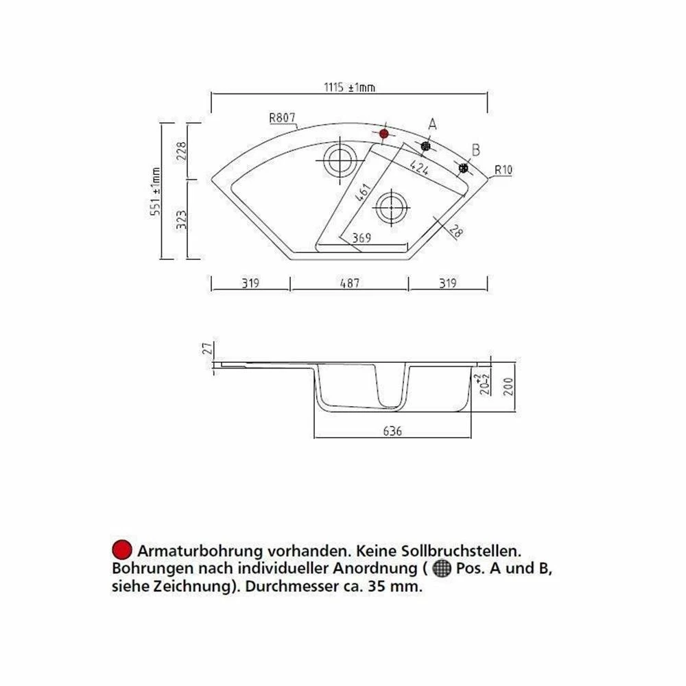 - bei einem Arbeitsplatten-Ausschnitt mit Eckradien kann die Spüle mit Eck-Radien gefertigt werden: 4 x r=10 mm. Dazu Artikel 9050 (Hersteller-Artikelnummer) bestellen