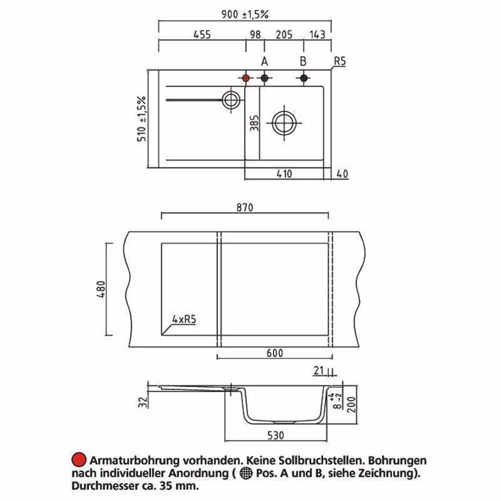 - Spülenmaß: B 900 x T 510 mm