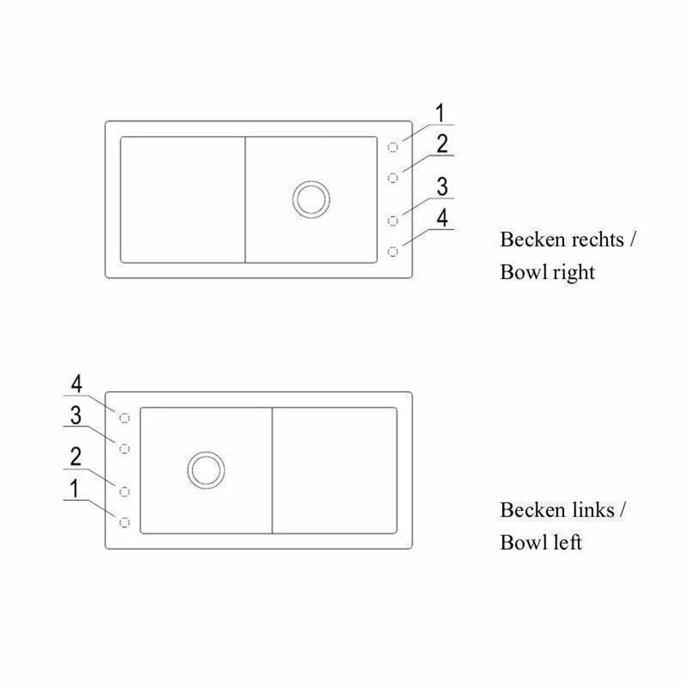 - Zusätzliche Bohrung, zum Beispiel für Spülmittelspender möglich (beachten Sie hierzu die Skizze mit den möglichen Bohrungen)