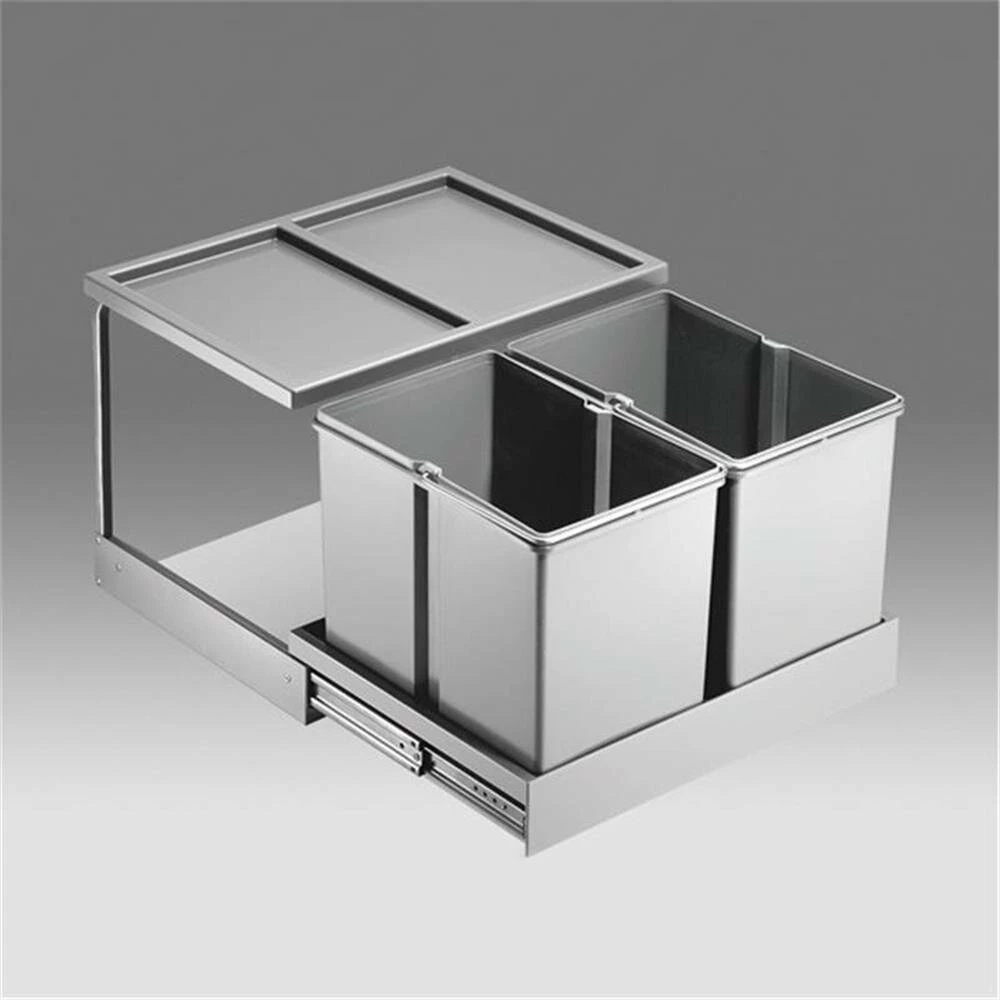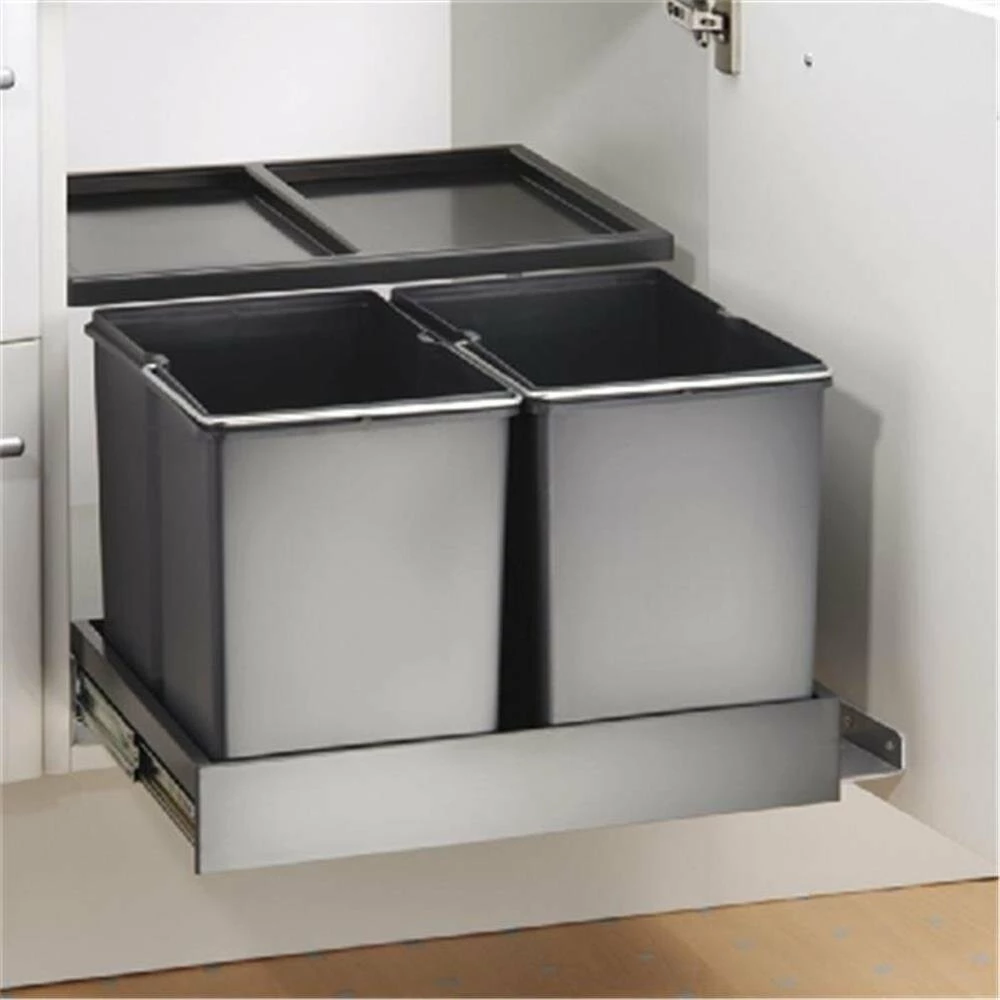 Beim Öffnen der Drehtür fährt das Doppel-Abfalltrennsystem selbsttätig aus dem Schrank heraus. Der Deckel bleibt im Schrank und dient gleichzeitig als Ablageboden. Für alle Drehtürenschränke ab 50 cm. Universell links und rechts montierbar.