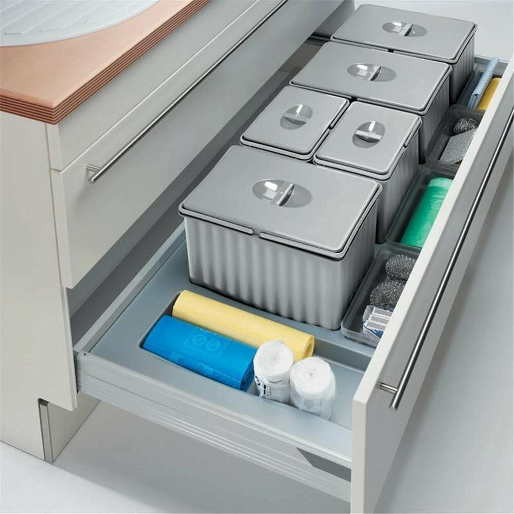Der umlaufende Flansch des Einsatzes ist so ausgelegt, dass er größer als alle serienmässigen Auszüge ist. Daher kann der Einsatz passgenau auf jeden Auszugstyp zugeschnitten werden. Abfallbehälter mit Einzeldeckel und zusätzlichen Ablageschalen als weitere Funktionselemente. Beim Einbau in unteren Auszug HFO-geeignet (elektrische Öffnungs-Unterstützung).